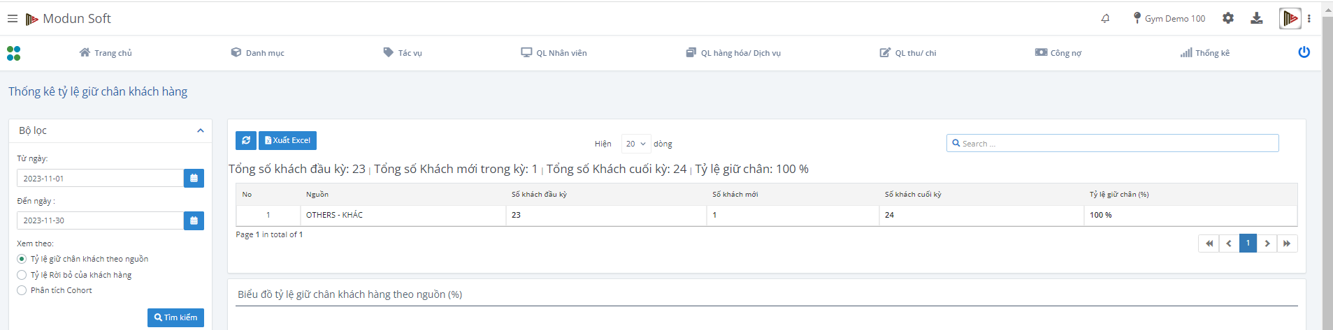 Nếu quản lý bằng thủ công, với một lượng khách hàng càng ngày càng lớn thì không cách nào doanh nghiệp có thể kiểm soát tỷ lệ giữ chân khách hàng qua từng tháng được. Cách tối ưu nhất là sử dụng phần mềm để kiểm soát khách hàng cũng như nhân viên của họ. Nắm bắt được sự cần thiết cũng như nhu cầu của các phòng tập, Modun đã phát triển thành công tính năng Thống kê tỷ lệ giữ chân khách hàng. Với tính năng này,  các chủ phòng gym có thể kiểm soát và đặt ra được mục tiêu về tỷ lệ giữ chân khách hàng, tỷ lệ phần trăm khách hàng quay trở lại với phòng tập của mình.